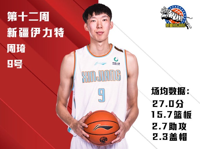 周琦在过去一周中带领新疆队取得2胜1负的战绩,他本人场均砍下27分、15.7个篮板、2.7个助攻和2.3个盖帽。新疆队以全华班阵容征战复赛依旧排名联赛第二,周琦在攻防两端的贡献显而易见。
