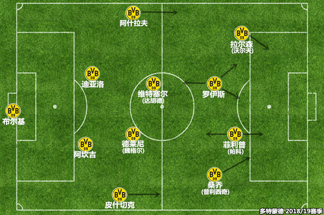 2018/19赛季,法夫尔打造了一个非对称的4231体系,年过而立的皮什切克成为“三个半”防线中的一员,左侧的阿什拉夫可以大胆助攻,法夫尔希望利用强势后驱来弥补左前卫(拉森&沃尔夫)锐度不足的缺陷。