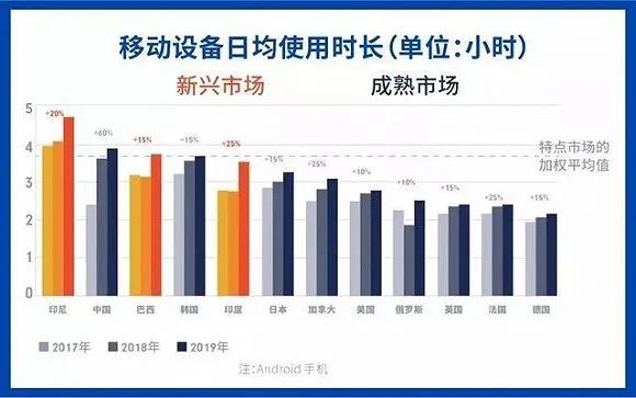 巴西约有2亿人口,其中66%是移动互联网用户,App Annie《2020年移动市场报告》显示,2019年全球用户日均移动设备使用时长为3小时40分钟,其中双印和巴西用户的日均使用时长排名靠前、且较往年有明显涨幅。