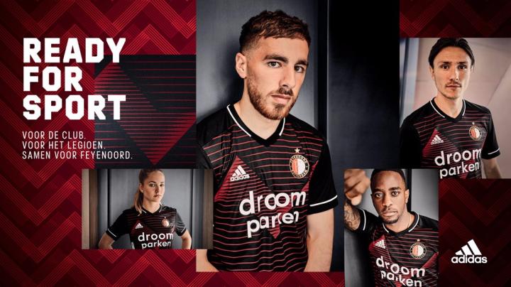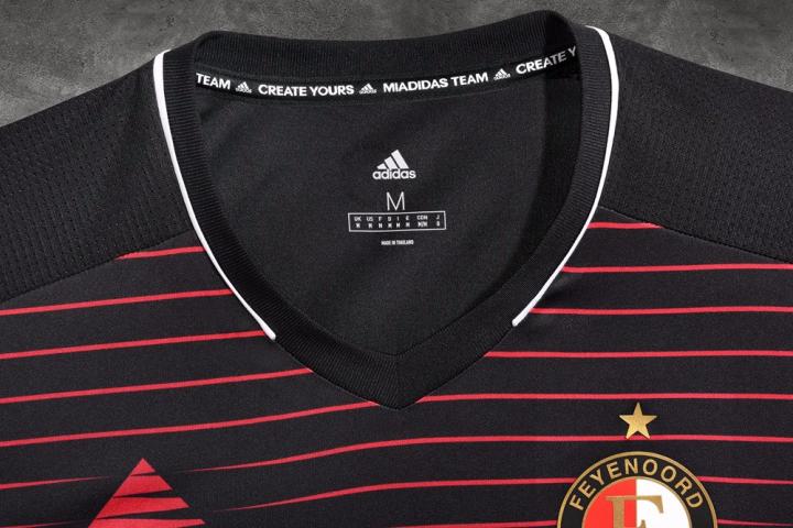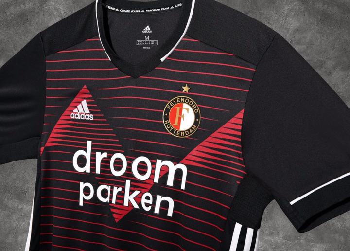 费耶诺德全新客场球衣以充满力量感的黑色为主色,并在球衣上加入代表俱乐部的红、白两色细节。球衣正面由红色水平细纹组成的几何渐变图案让人不禁想起上世纪90年代阿迪达斯经典球衣上的花纹,舒适的V领与袖口处加入白色镶边装饰,与球衣两侧的白色阿迪达斯胜利三条纹遥相呼应。