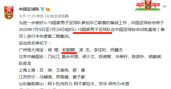 为备战2020赛季中乙联赛,中国足协今天正式公布了U19国青队最新名单,其中,昆陆青训培养的17岁纳西族小伙和韶麟成功入围。