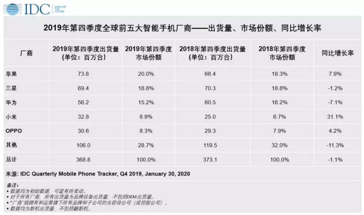 这几年来,随着 iPhone 售价节节走高的,是市场表现的持续低迷。实际上自从 2017 年 iPhone X 系列以来,每年换代几乎只有常规的性能升级,以及外观小改动,显然 iPhone 持续走高的售价和寥寥无几的创新点已经撑不起用户的换机意愿,这也直观的反映到苹果的市场表现中,在 2018 年末 iPhone 的销量开始出现连续四个季度的下滑,直到 iPhone 11 系列发布后才终于迎来反弹。IDC 的数据显示,在 2019 年第四季度,iPhone 的出货量增长迅猛,夺得了全球第一,而最主要原因就在于 iPhone 11 系列的大受欢迎,因为售价相比上代降低不少,而且在影像方面也有升级。