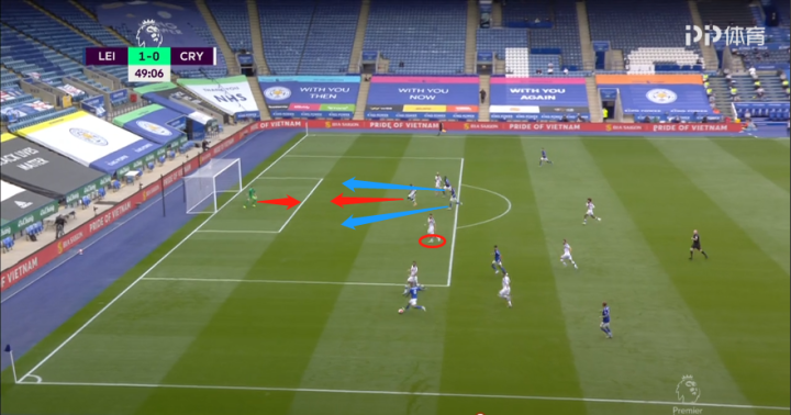 从回放来看,水晶宫防线出现了较大的问题。卡希尔虽然在位置但附近并没有莱斯特城的球员,萨科的注意力被前方的瓦尔迪带走,左后卫范安霍尔特内收协助但没跑在伊希纳乔身前,守门员瓜伊塔其实更多是被萨科干扰而导致自己犹豫没有去抱球,这样也就漏给了后点包抄到位的伊希纳乔,后者用自己不擅长的右脚打空门。除此之外,蒂勒芒斯的左脚传中也非常精准,找到了萨科和瓜伊塔的中间。