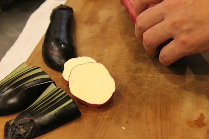 茄子大多身宽体胖,禁得起刀工折腾,适合酿馅,茄子禁得起煎炒烹炸,口味各不一样,是特别适合设计的蔬菜。