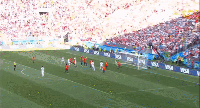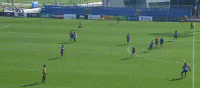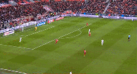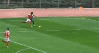越位视频4-防守队员判断球的运行路线,向球移动,跳起头顶球,该处理球动作被视为“有意触及”,处于越位位置的进攻队员得到球,不犯规,比赛继续。
