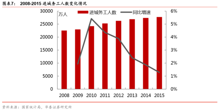 老干妈的品牌扩张乘上了我国城镇化的东风。随着我国城镇化建设的推进,基础设施建设和房地产投资不断扩大,对劳动力的需求攀升。农村进城务工人数也随之上升,2015年我国进城务工人员数量达到2.78亿人。