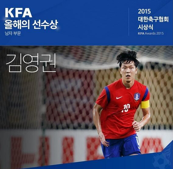 12月23日,韩国足协宣布效力于广州恒大淘宝队的韩国后卫金英权当选为2015年韩国足球先生。