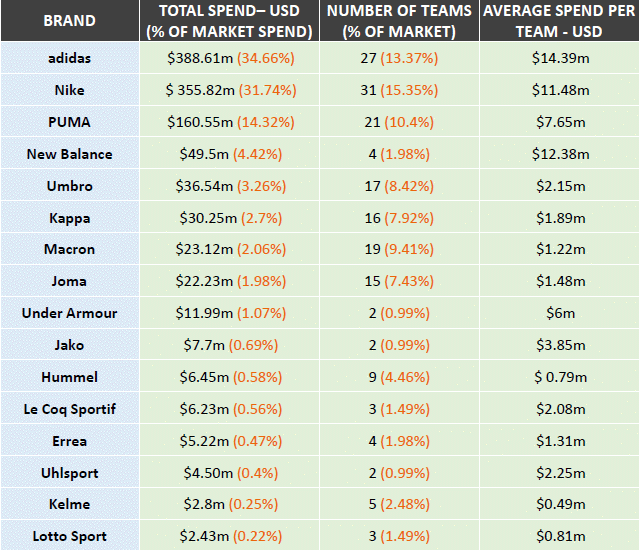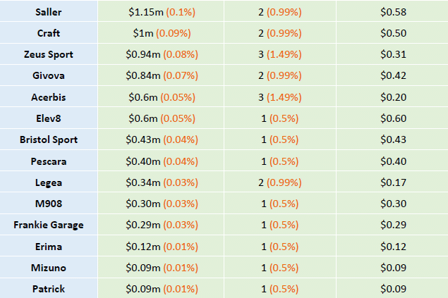 很多人看完这个名单,第一个问题或许就要问这是否是一个完全的名单?为何我所知道的某某某品牌没有在这名单上……你说对了,这就不是一个完整的名单。那为何只罗列这些不罗列其他?因为他们是足球球服赞助市场中最强大的12个;那为何是他们最强?明明我觉得某某最强,某某某比这名单上的某某某更强,很好的问题,这是因为从赞助总金额来说,这就是最大的12个,数据解决一切争议;好好好,数据党一定要看数据不然就是一百个不服,那我就在下面贴出具体数据和排名,也正好给冷门球衣粉丝一个福利让他们看看有哪些更冷门的球衣品牌可以购买。