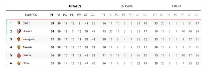 而西乙方面目前排名前二的加迪斯和韦斯卡将直通西甲,而排名第三到第六的皇家萨拉戈萨、阿尔梅里亚、赫罗纳和埃尔切,将会通过附加赛形式决出最后的一个升级名额。