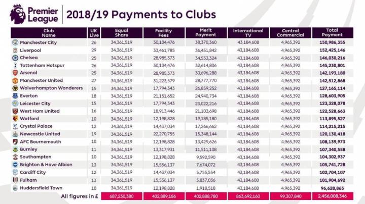 此图为2018/19赛季英超所有球队的转播分成数据,其中我们可以看到连垫底的,几乎可称为英超历史第一弱队的哈镇也能分到9600万欧元;而众所周知,英超升级附加赛长期以来被称为世界上最值钱的单场足球比赛,阿斯顿维拉在战胜德比郡升回英超后能够获得总共1.7亿英镑的收入。