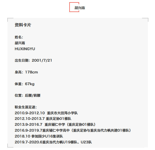 2020赛季即将到来,希望胡兴雨尽快融入球队,虚心学习刻苦锻炼,努力提高自我,迎接全新挑战,为球队做出自身贡献,继续为重庆战斗不息。