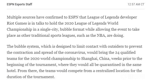根据ESPN报道,已经有多个消息源向他们确认,Riot计划采用统一城市赛前集中隔离的方法举办2020全球总决赛,此前计划的6个城市举办世界赛的计划将取消。除此之外还有消息表示,原定将于2021年在北美举办的S11世界赛或将继续在中国举办,北美举办权将被顺延至2022年举办。