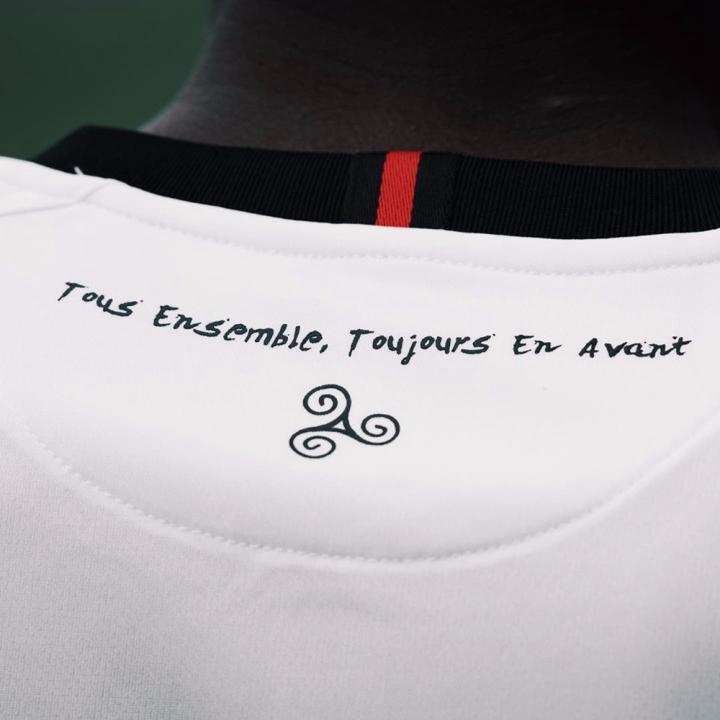 客场球衣则以白色为基调,配以代表俱乐部形象的红黑绶带条纹。红黑绶带条纹内加入展现俱乐部与所在的布列塔尼地区紧密联系的三曲腿图腾(Triskel)。此外,球衣背后衣领下方采用了与主场球衣相同的细节。