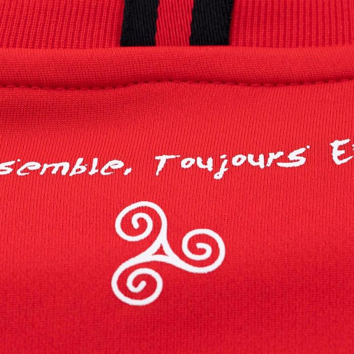 新赛季甘冈主场球衣继承了俱乐部经典的红黑搭配,一条黑色细竖条纹贯穿整件球衣的正面,打造出令人印象深刻的外观。球衣胸前的umbro Logo与俱乐部徽章徽章采用热压工艺打造。红色圆领背后印有俱乐部口号“Tous ensemble,toujours en avant”(全力以赴,始终向前)以及展现俱乐部与所在地区紧密联系的三曲腿图腾(Triskel)。