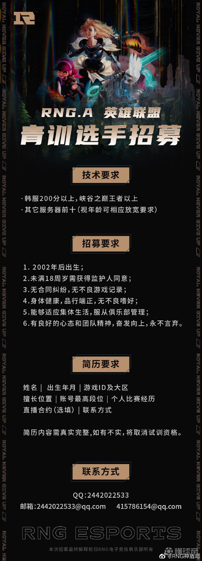 “RNG.A英雄联盟分部正式招募青训队员啦!这里有专业的教练团队,完善的培养体系,试训通过更有机会登上LDL和LPL的舞台!快加入RNG电子竞技俱乐部吧!”