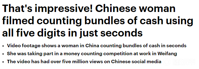 报道表示,这则山东潍坊点钞竞赛的考核片段拥有“中国社交媒体五百万惊人点击”,其采用的经典五指计数法效率和精准度远胜点钞机。