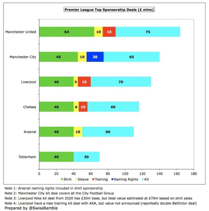 不信我们一个个来看看,首先从英超的曼城开始。这是彪马的王牌球队,从耐克手上砸巨资抢来的。国内外的冠军粉还是很多的,现在曼城的流量按照德勤的全球统计已经是英超第二了,所以从这个角度来看这笔钱还是值得的。那到底所谓巨资是多少?6500万镑,而且这个东西有了比较才能有伤害,因此我给大家看下图,曼城排英超第二,仅次于曼联。有人说不对啊,利物浦的7000万镑才是第二,这要看图下的小字,这个7000万镑是基于3000万固定加上球衣销售提成臆想出来的数字,疫情之前我可以说这数字是预估,疫情之后这7000万的数字那只能说是利物浦的一场梦,因此固定赞助费6500万的曼城排第二。