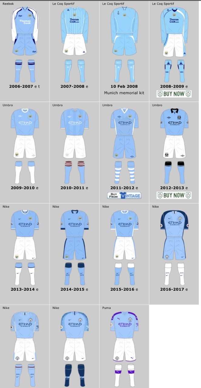 说回曼城的球服,历史上看,曼城当之无愧的是一个与维冈竞技同级别的升降机球队。在顶级联赛和二级联赛中升升降降,小日子不亦乐乎。从其球衣赞助的品牌就可以看出,基本是小众品牌的博物馆。然后有了头巾爸爸后,终于有了国际大牌的青睐。并且更换了以前那个小家子气十足的山寨老鹰队标以及那三颗自欺欺人的大星星。