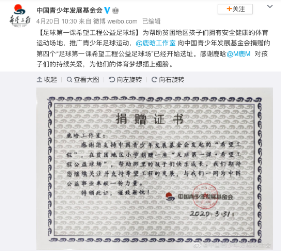 鹿晗曾为贫困地区捐建了多个足球场