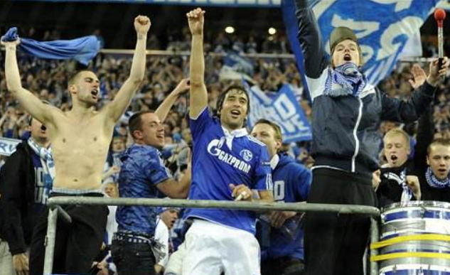 劳尔在看台上和沙尔克球迷一起庆祝胜利