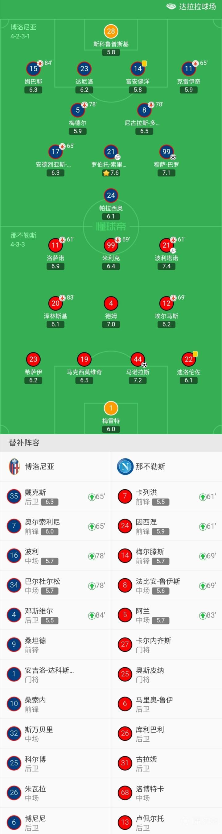 博洛尼亚首发:28-斯科鲁普斯基、15-姆巴耶(84'4-邓斯维尔)、23-达尼洛、11-克雷伊奇(65'35-戴克斯)、8-多明格斯(78'16-波利)、5-梅德尔(78'34-巴尔杜尔松)、17-奥尔森(65'7-奥尔索里尼)、21-罗伯托-索里亚诺、99-巴罗、24-帕拉西奥