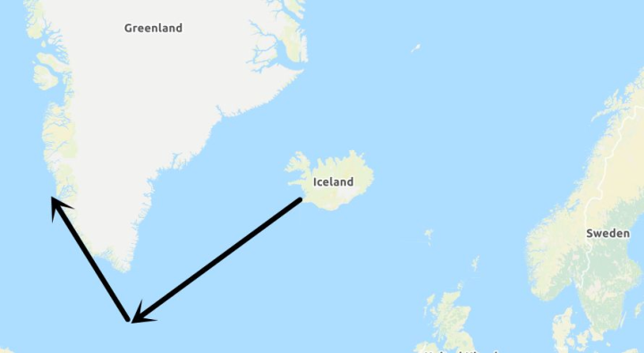 ▲982年,埃里克从冰岛出发,向西航行发现了北美格陵兰岛。与后来哥伦布从西班牙出发横穿大西洋的航线不同,维京人的航线要近许多,但是他们的航线极北,气候严寒。