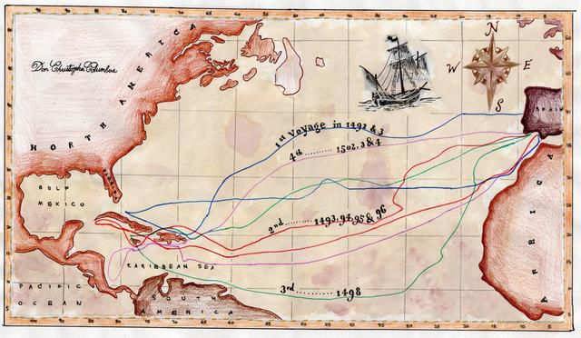 ▲哥伦布航行图,他从伊比利亚半岛出发,穿过大西洋中部,抵达加勒比群岛,从而发现美洲。但搞笑的是,一直到其去世,他本人一直认为自己到达的地方是印度