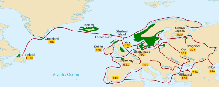 ▲维京人劫掠范围,他们从北欧出发,踪迹遍布了全欧洲,图中标蓝色和红点的地方均为维京人在7-10世纪占领的土地