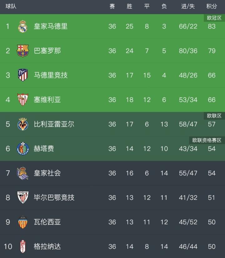 上轮比赛过后,皇马、巴萨、马竞和塞维利亚已经确定获得下赛季欧冠的参赛资格。本赛季国王杯决赛将在皇家社会与毕尔巴鄂竞技之间展开较量,胜者将获得一个欧联参赛资格,比利亚雷亚尔与赫塔费也有机会通过联赛排名靠前的成绩来赢得剩余两个欧战席位。