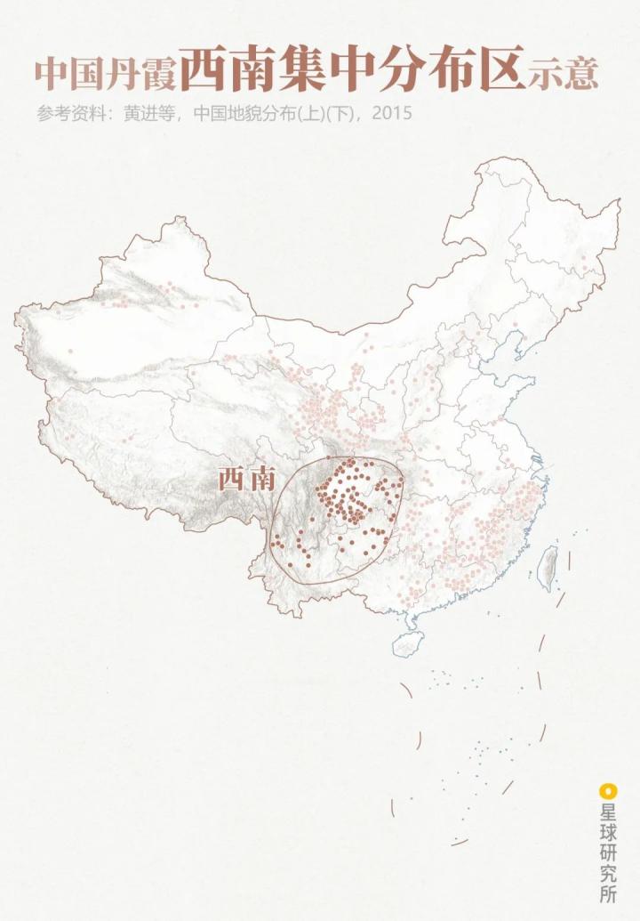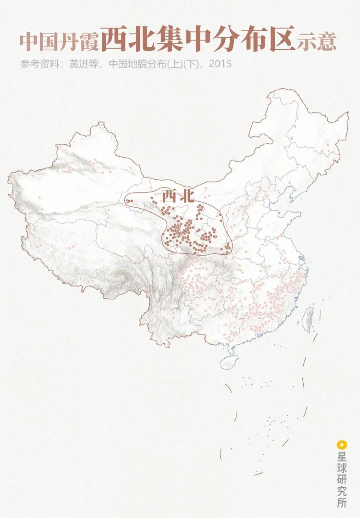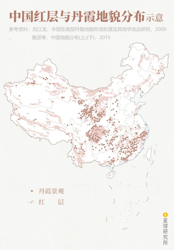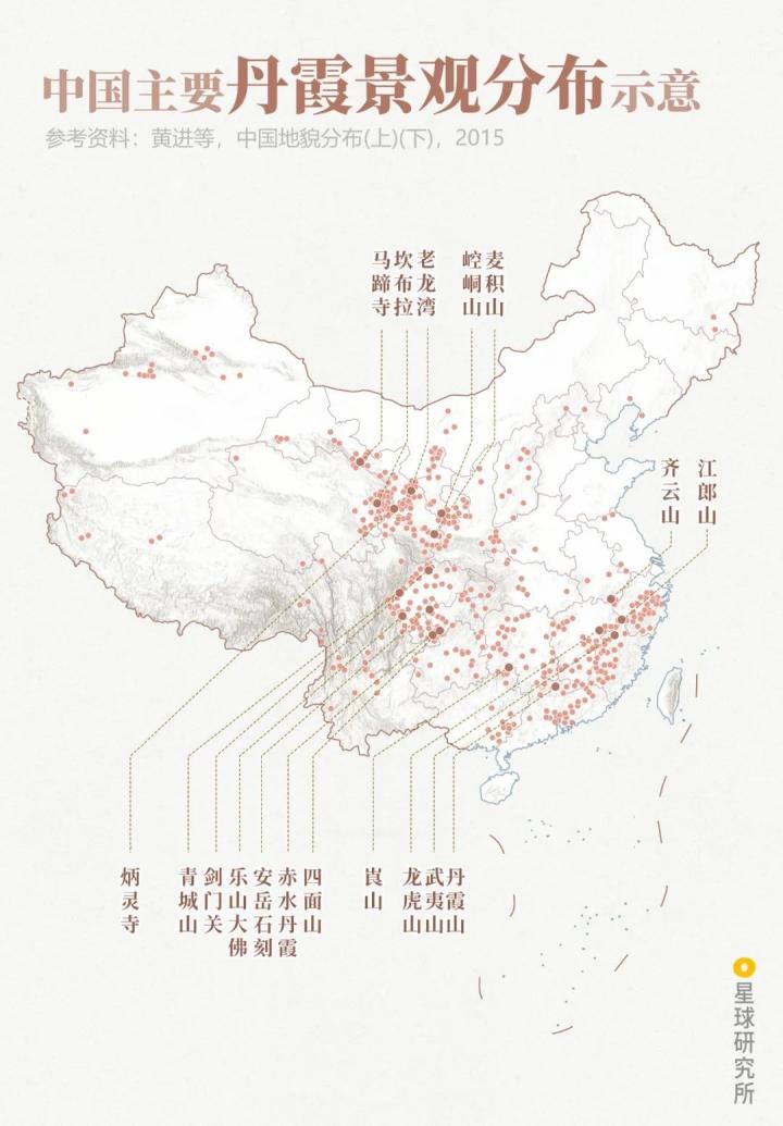 (中国主要丹霞景观分布示意;制图:陈景逸&郑伯容/星球研究所)