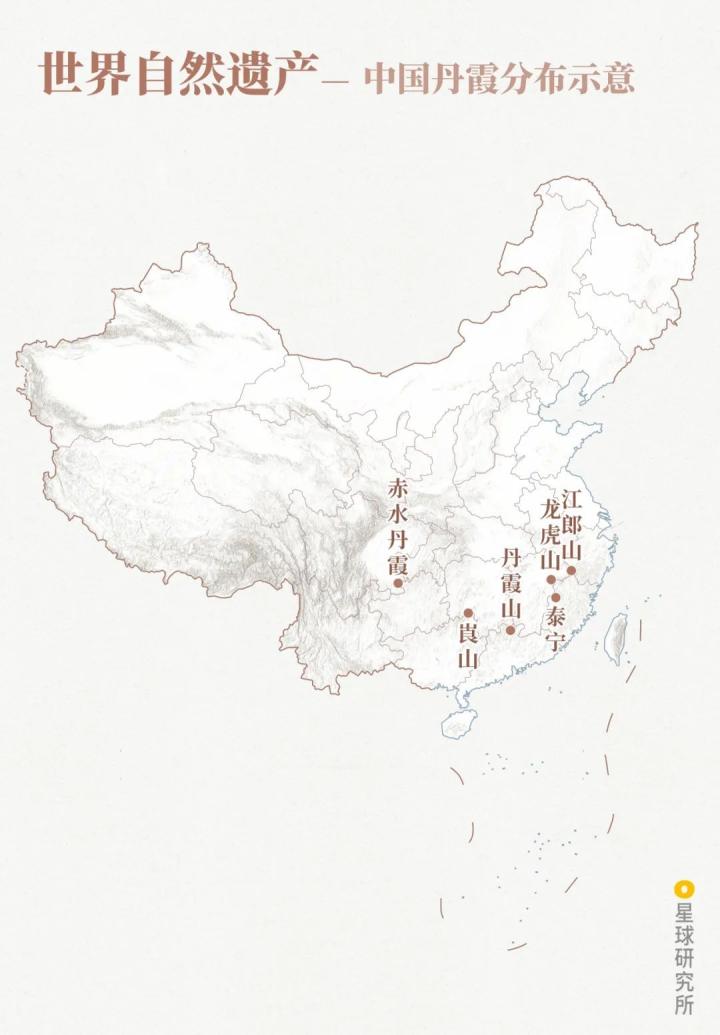 (世界自然遗产-中国丹霞分布示意;制图:陈景逸&郑伯容/星球研究所)