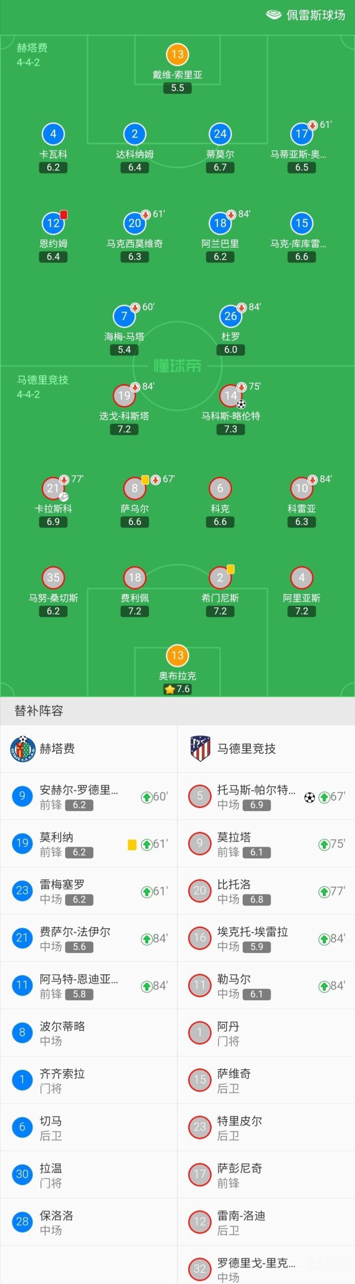 马德里竞技首发:13-奥布拉克、14-马科斯-略伦特(75'9-莫拉塔)、2-希门尼斯、4-阿里亚斯、18-费利佩、35-马努-桑切斯、6-科克、8-萨乌尔(67'5-托马斯-帕尔特伊)、10-科雷亚(84'11-勒马尔)、21-卡拉斯科(77'20-比托洛)、19-迭戈-科斯塔(84'16-埃克托-埃雷拉)