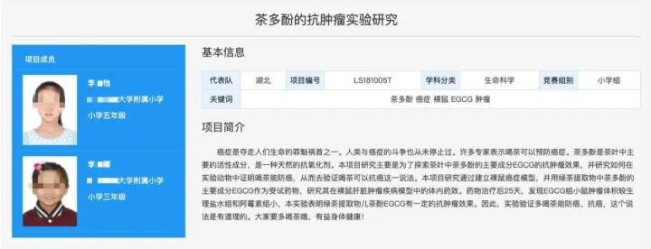 能研究肿瘤的不只他一位「小学生」。在全国青少年科技创新大赛的在线展厅中,陈列着另外两个「小学生」的研究项目:「茶多酚的抗肿瘤实验研究」。该项目获得了第 33 届全国青少年科技创新大赛三等奖。这两位同学,一个当时在读三年级,一个在读五年级。