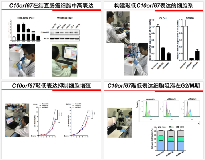 “本项目前期利用遗传学比较分析了高原家养哺乳动物和对应平原物种的基因组和转录组,发现了高原哺乳动物低氧适应受选择的关键突变基因 C10orf67,并构建了 C10orf67 基因敲除小鼠,通过细胞生物学,生物化学、动物模型、临床样本分析等方面对 C10orf67 在结直肠癌发生发展中的作用进行解析,发现 C10orf67 在结直肠癌中高表达,敲低其表达可以显著抑制细胞的增殖,将细胞阻滞在 G2/M 期。进一步的研究表明 C10orf67 可以调节结直肠癌细胞对化疗药物的敏感性。”