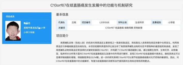 「 C10orf67 在结直肠癌发生发展中的功能与机制研究」——这句看似天书的话,其实是一位六年级小学生的研究项目,并且该项目获得了第 34 届全国青少年科技创新大赛三等奖、第 34 届云南省青少年科技创新大赛青少年科技创新成果竞赛项目一等奖。