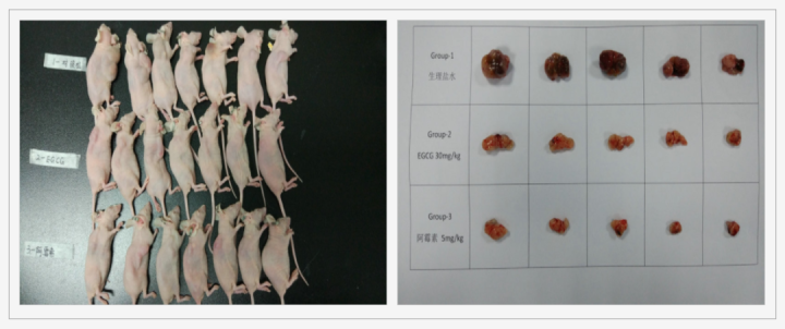 “本项目研究通过建立裸鼠癌症模型,并用绿茶提取物中茶多酚的主要成分 EGCG 作为受试药物,研究其在裸鼠肝脏肿瘤疾病模型中的体内药效。药物治疗后 25 天,发现 EGCG 组小鼠肿瘤体积较生理盐水组和阿霉素组小,本实验表明绿茶提取物儿茶酚 EGCG 有一定的抗肿瘤效果。”