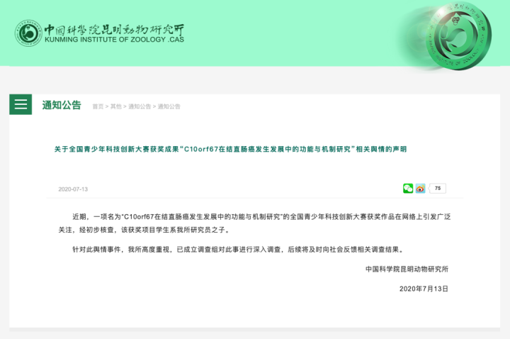 首先是研究「 C10orf67 在结直肠癌发生发展中的功能与机制」的同学。7 月 13 日,中国科学院昆明动物研究所发表声明,称该同学的父亲是其研究所的研究员。