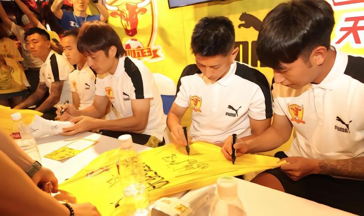 7月19日下午4时,四川九牛足球俱乐部的杨超、阮君、汪嵩、王楚、赵恒、张佳祺共6名主力队员出席了新赛季球衣首发仪式暨签售会,热情的球迷们组成的黄色海洋高呼“四川雄起”,为球员打气助威。