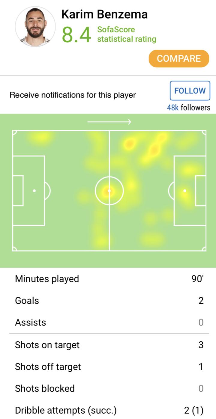 本泽马对比利亚雷亚尔的热图,他在比赛中梅开二度