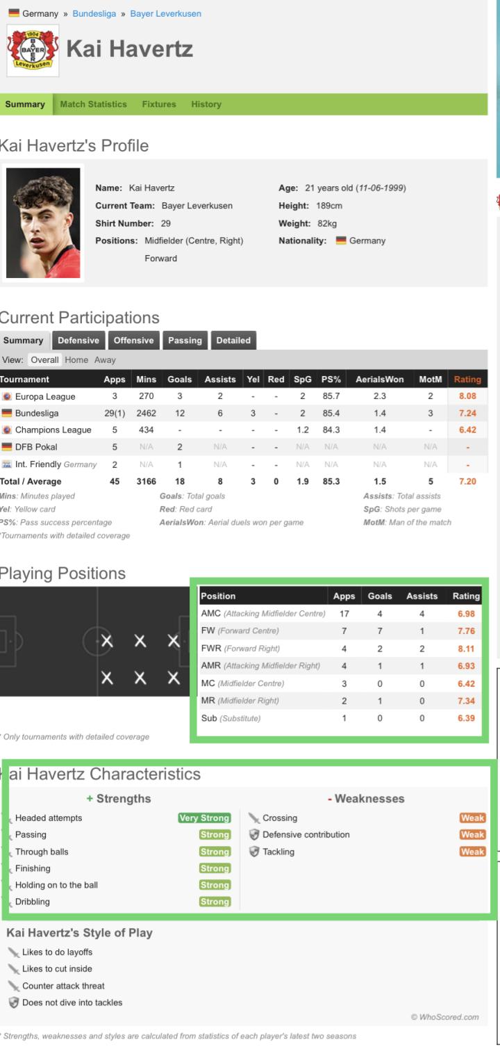 哈弗茨的长处和缺点。长处如头球、传控、把握力和停/护球能力都适合他在更靠前的位置发展;反而协防能力和拦截的缺点,会成为她在中场中位置发展的障碍。他在中锋位置的平均分为7.76分,在前腰为6.98分,在中场中只有6.42分,右边锋却有8.11分