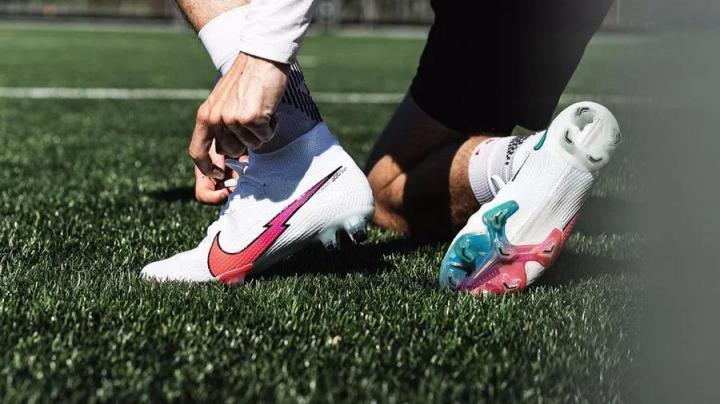 两款Mercurial刺客大底没有变化,Superfly和Vapor依旧采用分离式大底设计,颜色上则采用与Swoosh一样的配色方案,采用横向由外侧粉红色过渡到内侧蓝青色渐变效果,再加上电镀质感处理工艺,可以说是整双球鞋最闪耀的地方。