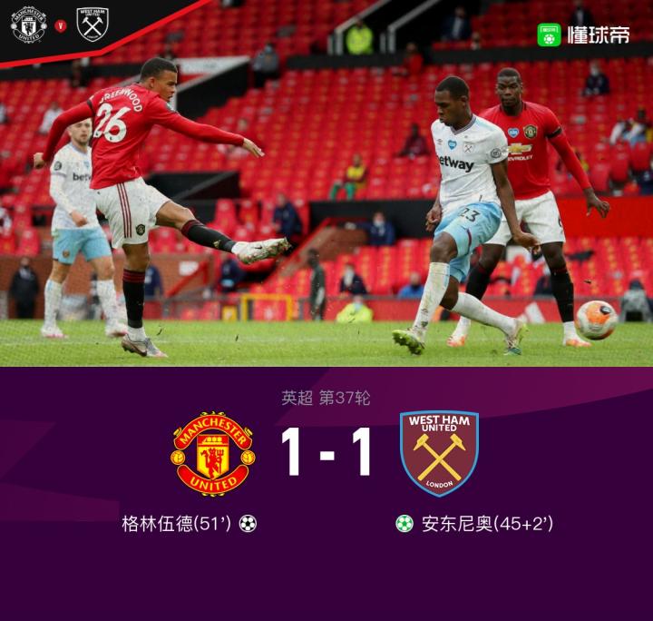 第50分钟,马夏尔背身做球,格林伍德低射破门,曼联1-1西汉姆联!