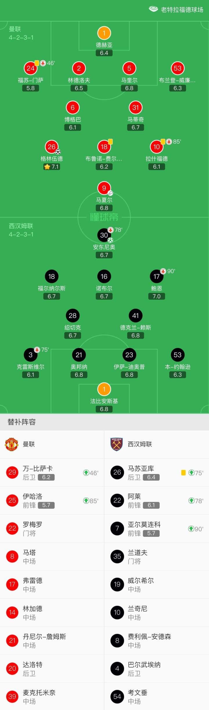 曼联首发:1-德赫亚、24-福苏-门萨(46' 29-万-比萨卡)、2-林德洛夫、5-马奎尔、53-布兰登-威廉姆斯、31-马蒂奇、6-博格巴、26-格林伍德、18-布鲁诺-费尔南德斯、9-马夏尔、10-拉什福德(84' 25-伊哈洛);