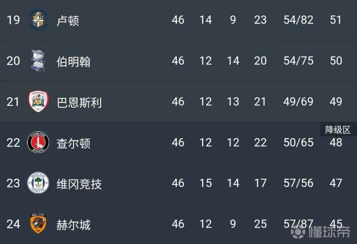 而在积分榜另一端,查尔顿、维冈竞技和赫尔城则遗憾降入英甲联赛。其中维冈竞技因为申请破产托管而被罚了12个积分。