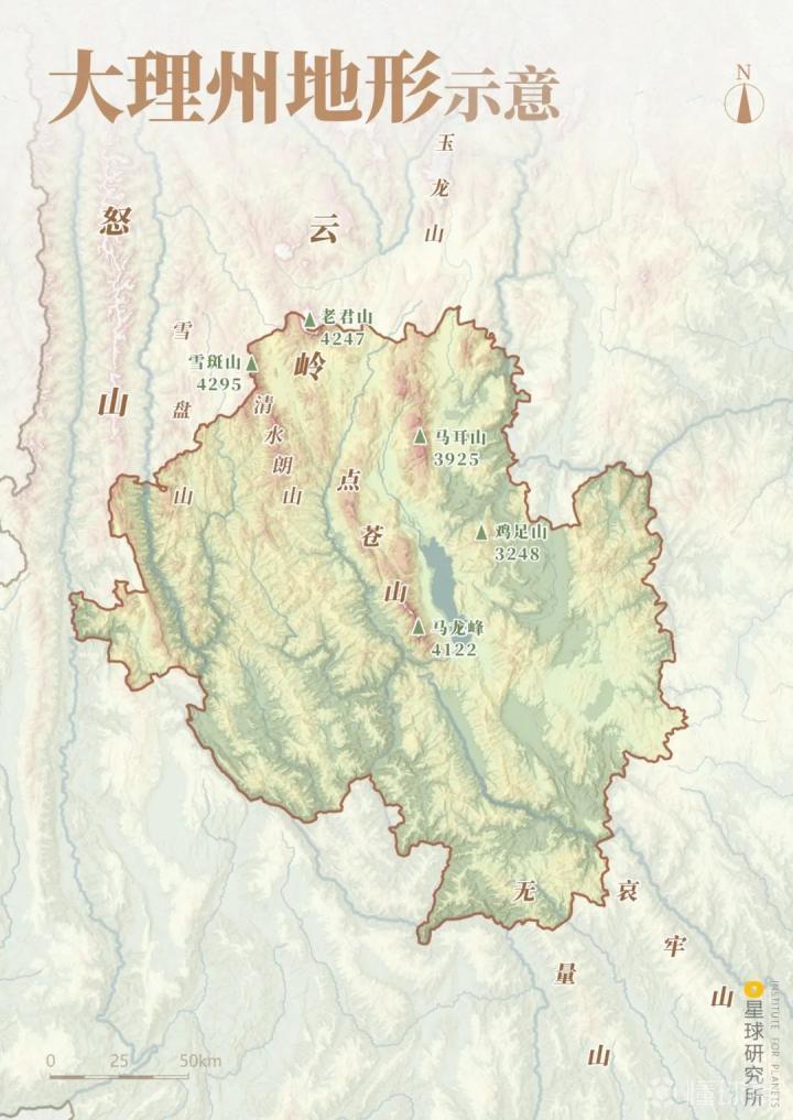 (大理州地形,面积约2.95万平方千米,制图@郑伯容&陈志浩/星球研究所)