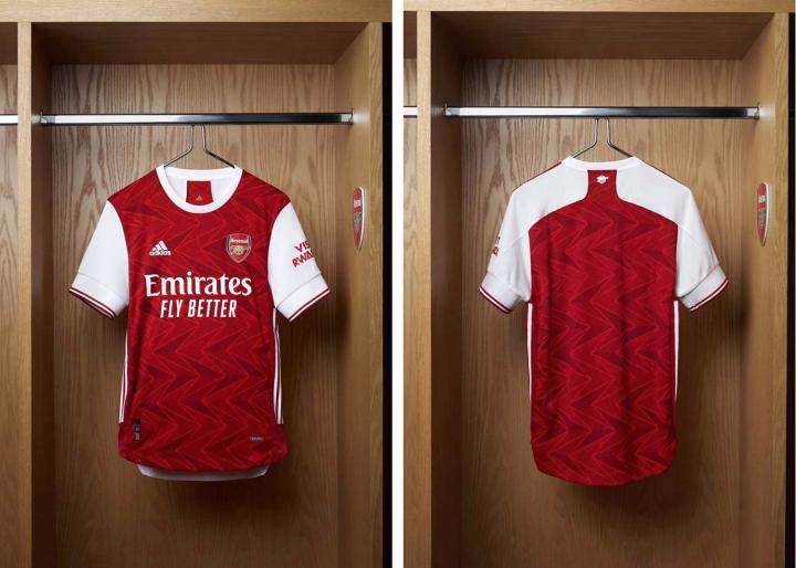 全新主场球衣延续了经典的红、白两色搭配,由深浅不同的红色组合而成的箭头图案灵感源自于俱乐部在上世纪30年代至40年代期间使用过的几何徽章致敬,球衣上的V字形图案受到徽章中的字母“A”的启发,也是对海布里球场著名的大理石大厅地板上的瓷砖纹样的致敬。