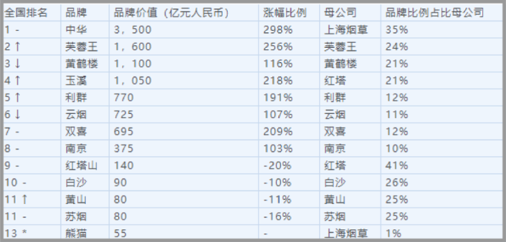三是名响,中华烟品牌价值在国内无出其右,无论什么榜别的品牌可能每年有上有下,但中华永远稳居第一。