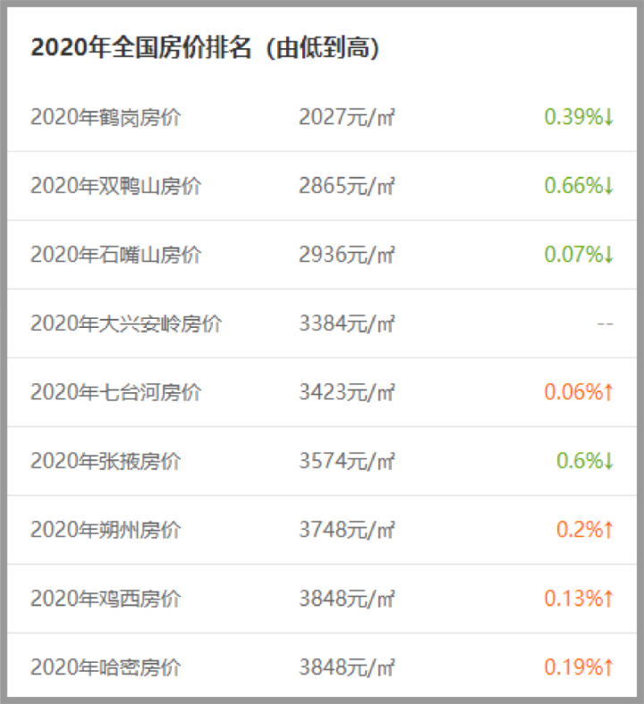东北地区的物价水平一直都较为温和,而东北的房价更不必多说,2020年全国房价从低到高排,前十个城市东北自己就占了五个,鹤岗稳居MVP。