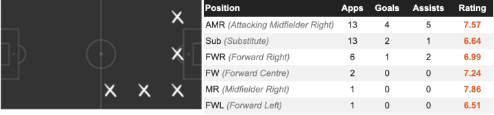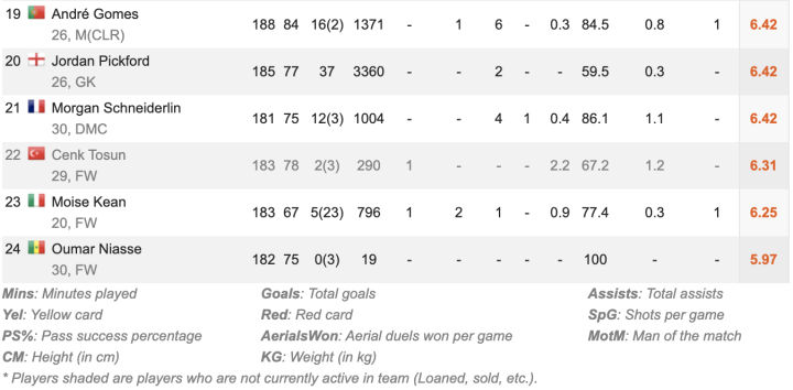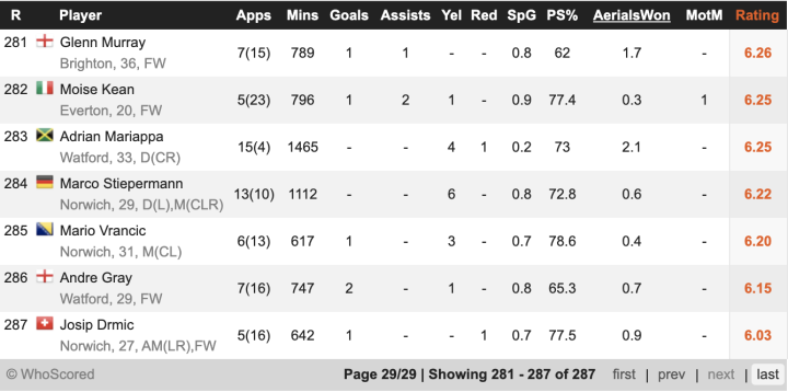 虽然是免签转会而来,但是德尔米奇的定位就是球队的轮换单前锋,这样的表现只能被冠以“令人失望”的字眼。足球数据网站whoscored为德尔米奇本赛季给了的6.03分的评分,在首发出场的5场比赛他只获得了5.96的超低分。这个评分是在287名出场超过英超平均值的球员中最低的一位。