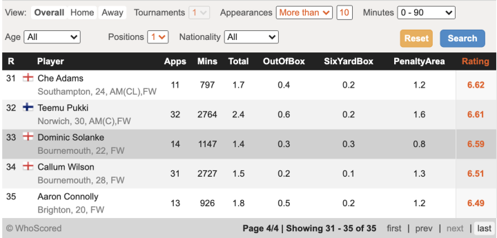 (图)亚当斯在首发出场超过10次的35名英超中锋当中首发表现排在第31名